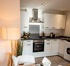 The living room is directly connected to the modern open plan kitchen included fridge-freezer, washing machine, microwave, oven, kettle, toaster, kitchen utensils, dining table.